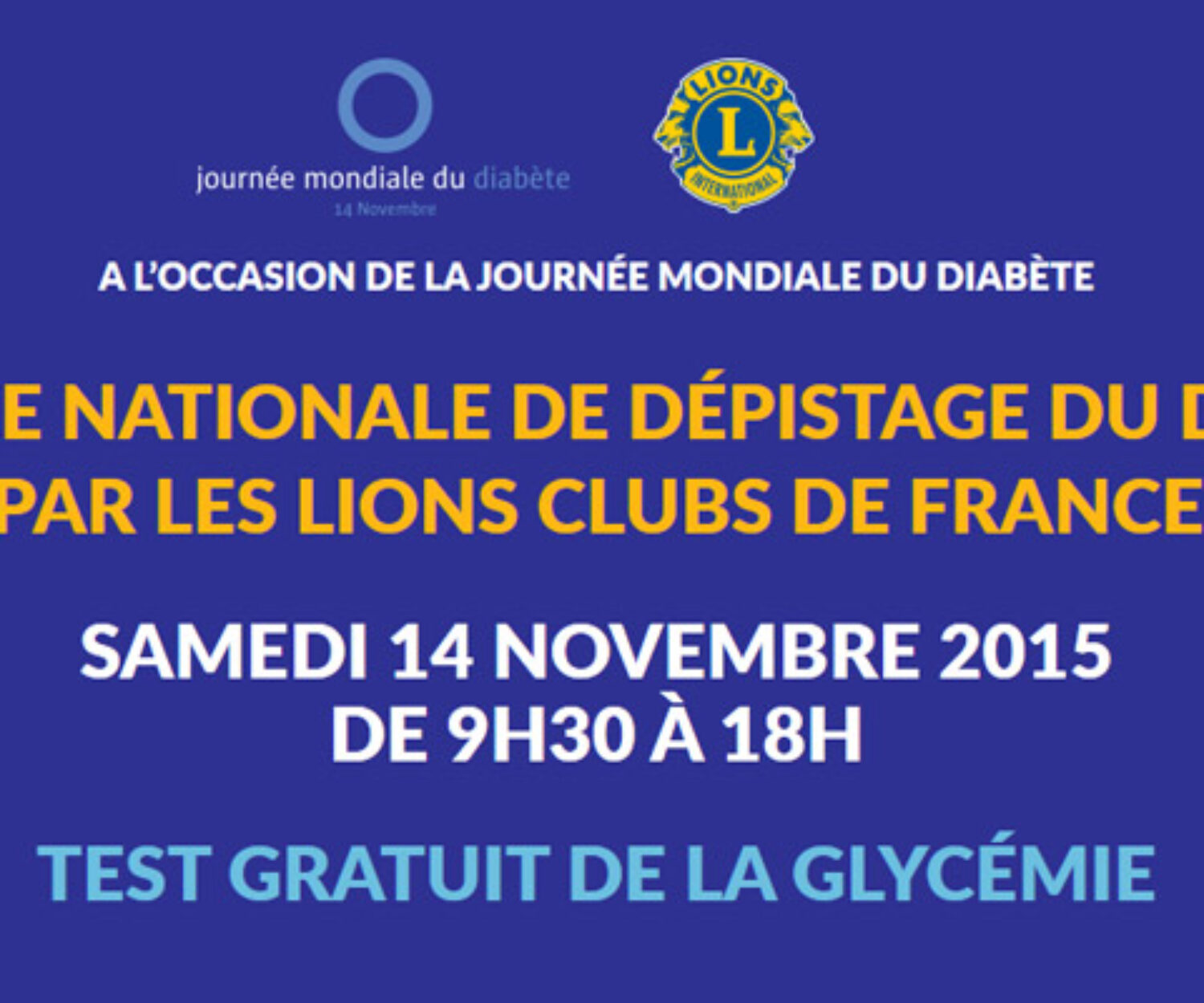 AGENDA 12 Nov 2015 JOURNÉE NATIONALE DE DÉPISTAGE DU DIABÈTE Le Samedi 14 Novembre 2015, dans le cadre de la journée mondiale du diabète, LIDER Diabète lance avec les Clubs… LIDER Diabète