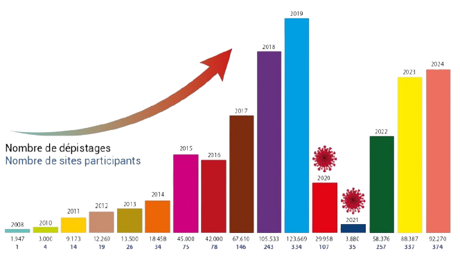 • 2024 Le cap des 700 000 dépistages est franchi avec une prévalence de 5% de testés hors limites.